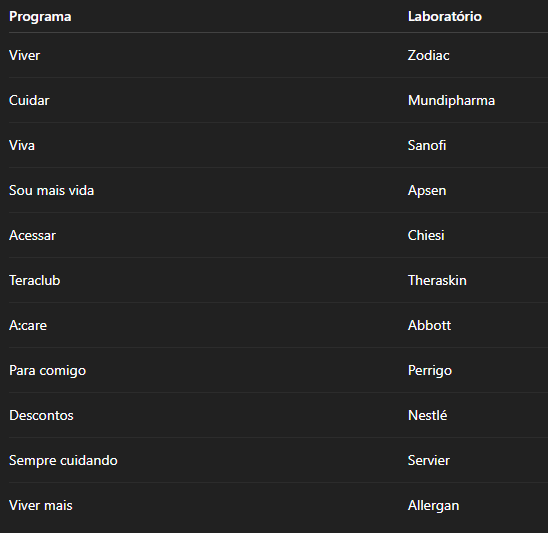 • Programas de Indústria: realizados em parceria com laboratórios farmacêuticos, disponibilizando descontos diretos ao consumidor.
